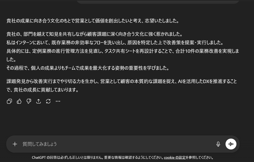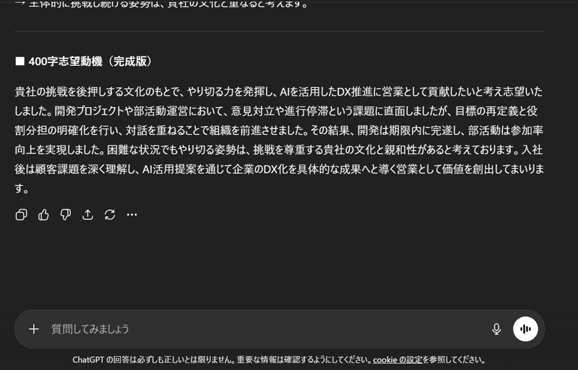 一度出力した志望動機をさらにブラッシュアップしたい場合は、追加のプロンプトを投げることで改善できます。以下のような指示が効果的です。